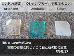 しかしお墓の免震施工に使うウレタンには大きな欠点がありました。それは、熱・水分・紫外線に弱く溶けてしまうということです。ましてやお墓は屋外にあるもの。ウレタンにとっては厳しい環境といえるでしょう。"絆"はこれらをクリアする為に特殊構造シリコンを用いています。シリコンは、熱・水分に強い為、屋外向きと言えるでしょう。