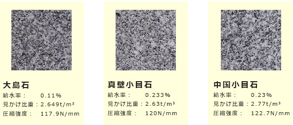 一般的に墓石等に使用される石は、基本的に花岡岩(通称:みかげ石)・安山岩・班レイ岩等が代表的なものです。日本産をはじめ、中国・インド等・世界各国みかげ石が広く墓石として使用されています。また国産材は外国産より石種により価格が高くなります。しかし日本の気候風土に適した石材であり、何百年も前から使用されているため、お客様にご安心してご提案できます。
