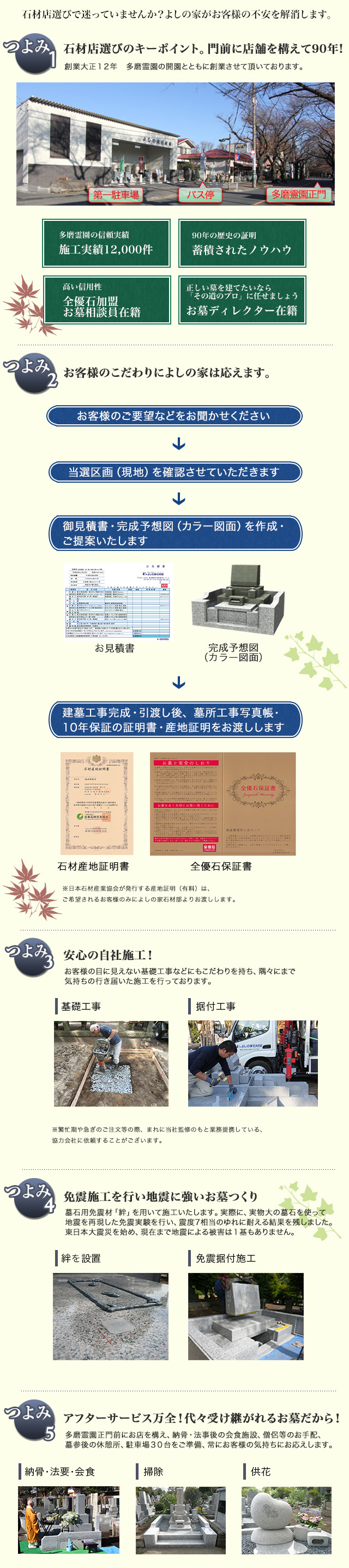 まずはお客様自身が気に入った石材をお選びする事と産地表示や石の特性・加工等のお話をしっかり説明できる石材店を選んでご判断下さい。